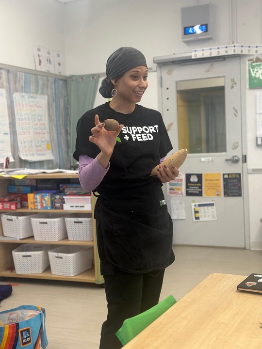 For week two, we focused on sweet potatoes. Students explored the sweet potato and learned about this nourishing root vegetable’s deep connections to African and African American food traditions, and how it has become a staple of Black American cooking. We made whipped cream together and enjoyed sweet potato pudding combining orange, white, and California purple sweet potatoes!