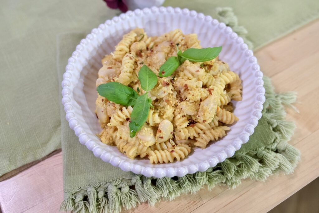 The basic idea of this dish is so versatile and can make use of any vegetables I need to use up, I make some version a couple times a month. It is also the easiest way to add lots of fiber and protein to the comfort and familiarity of pasta. It doesn’t hurt that It tastes creamy and decadent!
