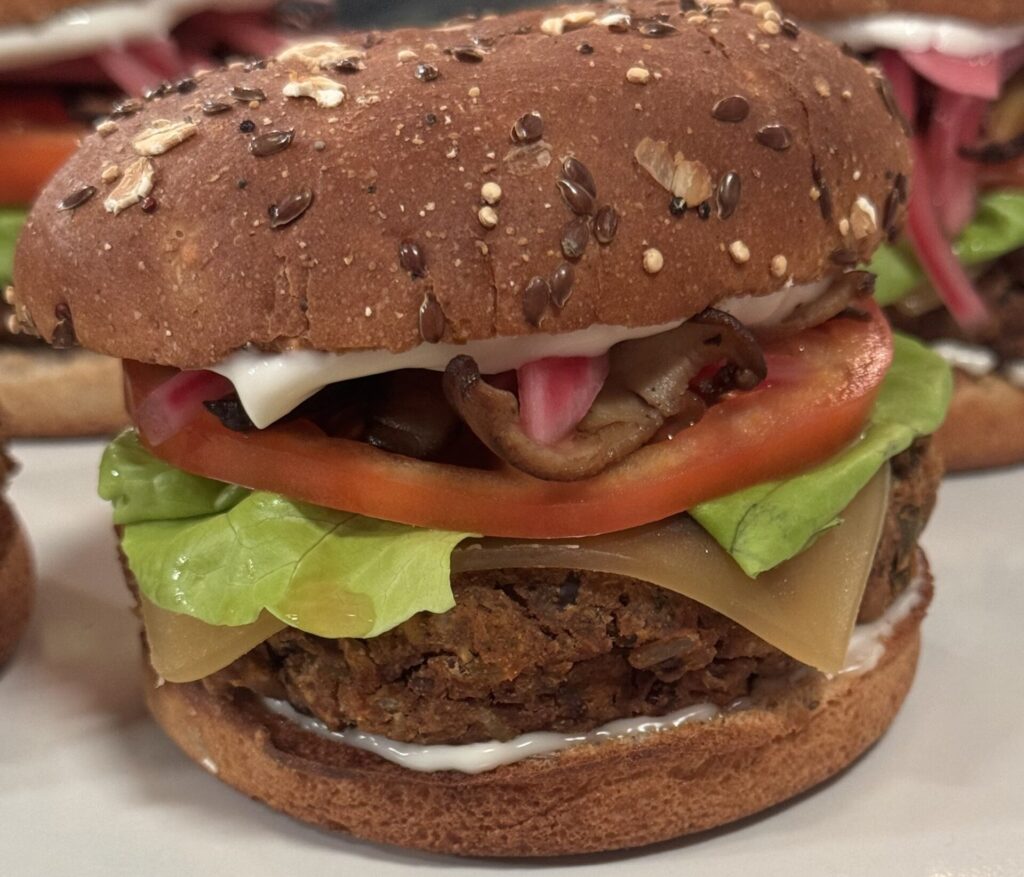 - Your favorite burger toppings – Lettuce, tomato slices, onions- raw, carmelized, or pickled, avocado, vegan mayo, ketchup, mustard.